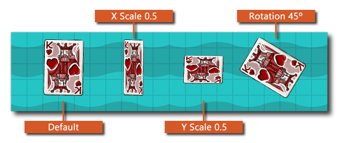 Cette fonction va dessiner le sprite donné similaire à l'action Draw Sprite mais avec des options supplémentaires pour changer l'échelle, le mélange, la rotation et le cadre de l'image-objet en cours de dessin. La modification de ces valeurs ne modifie pas la ressource de quelque manière que (seulement comment elle est), et vous pouvez utiliser l' une des disponibles variables de propriété sprite au lieu de valeurs directes pour tous les arguments de la fonction. L'image ci-dessous illustre comment différentes valeurs affectent le dessin de l'image-objet: