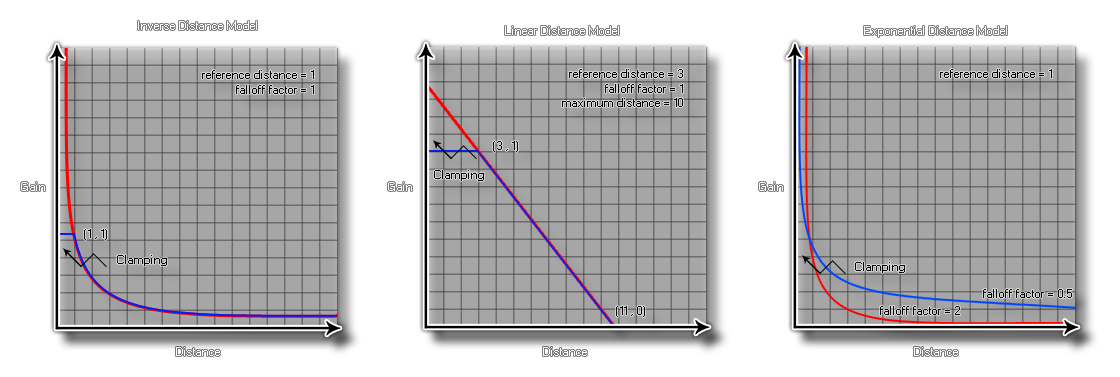 Lorsque vous définissez la chute dans votre jeu avec les fonctions appropriées, il y a trois arguments que vous devrez définir, et chacun est approprié à un modèle spécifique et affectera la façon dont le son final est "entendu" par le joueur en fonction de la distance que l'auditeur provient de la source. Les trois arguments sont: