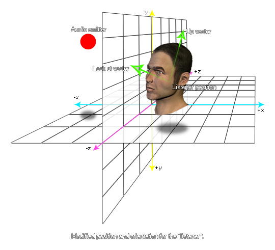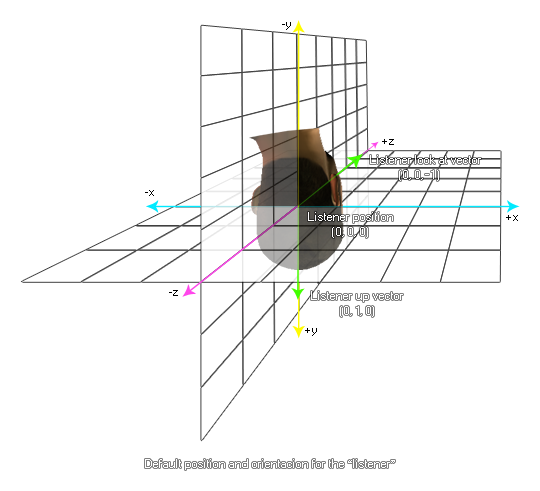 Avec cette fonction, vous pouvez changer l'orientation de l' auditeur dans l'espace audio 3D. Le regard sur la direction et la direction ascendante sont basés sur les vecteurs qui sont résolus à partir des positions relatives x, y et z, et par défaut à (0, 0, 1000) pour la direction de regard et (0, 1, 0) pour la direction haute, comme indiqué dans l'illustration ci-dessous: