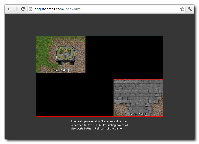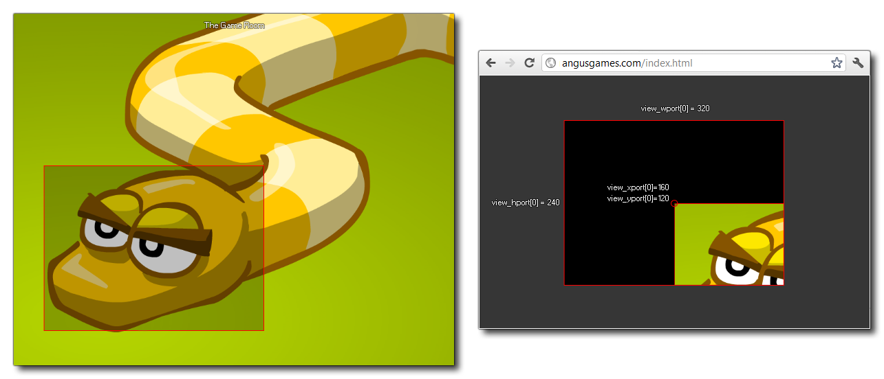 Avec ce tableau intégré, vous pouvez obtenir ou définir la position y du port d'affichage donné. Le port de vue est la zone sur l'écran où la vue est dessinée, et vous pouvez avoir jusqu'à 8 actifs à la fois (le tableau est des valeurs de 0 à 7 inclus pour donner 8 ports). Maintenant, la valeur par défaut pour GameMaker Studio 2 est que la fenêtre de jeu (ou toile de fond) est de la même taille que la pièce. Cependant, lorsque vous activez les ports et les caméras, ce comportement change et la taille totale du cadre est utilisé. Donc, si vous avez deux ports de vue différents à deux positions différentes, la zone totale qu'ils couvrent définit la taille de la fenêtre de jeu. L'image suivante illustre ceci: