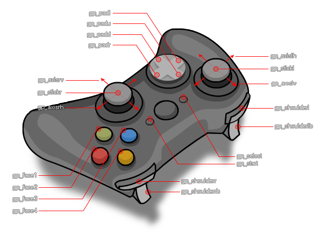 Les gamepad "slots" sont indexés à partir de 0 avec les slots 0 - 3 inclus étant uniquement pour les gamepads Xinput, à savoir: les contrôleurs Xbox360 et compatibles. Cependant, vous pouvez également vérifier les slots 4 - 11 inclus pour les gamepads DirectInput, ce qui signifie que vous pouvez détecter de nombreux autres modèles de contrôleurs lorsqu'ils sont connectés via ces slots. Il convient de noter que lorsque vous utilisez les manettes de jeu DirectInput, les constantes indiquées ci-dessous peuvent ne pas correspondre exactement aux boutons que vous attendez lorsqu'elles sont enfoncées, à cause de la manière fragmentée et non standardisée de l'API. Il est recommandé d'avoir une sorte d'écran de configuration de la manette de jeu dans vos jeux où les gens peuvent redéfinir les boutons de la manette en fonction de l'entrée de n'importe quel appareil connecté pour atténuer les problèmes. Notez également que l'interface d'entrée directe est exécutée en mode coopératif, ce qui signifie que votre jeu n'a d'accès que lorsqu'il est l'application de premier plan, ce qui provoque la perte des contrôleurs d'entrée directe si le jeu utilise le focus et le trouve ensuite à nouveau quand il revient sur le point (cela peut être détecté dans l'événement système et traité).