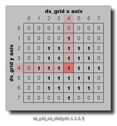 Avec cette fonction, vous pouvez définir une région circulaire d'une grille à une certaine valeur. Vous devez fournir une cellule de départ (en tant que coordonnées de l'axe x et y), ainsi que le rayon du disque à définir et la valeur que vous souhaitez définir pour le disque, comme illustré ci-dessous: