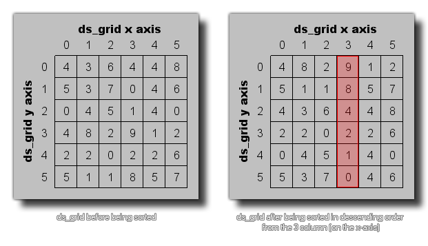 Cette fonction peut être utilisée pour trier un fichier ds_grid en fonction des valeurs d'une colonne donnée (de la même manière que vous triez les fichiers par date, taille, etc... dans l'Explorateur Windows). L'image suivante montre un exemple: