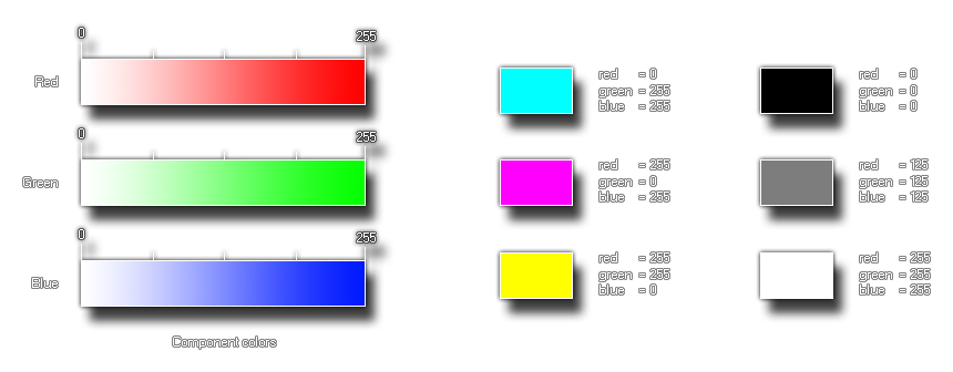 GameMaker Studio 2 fournit cette fonction (ainsi que d'autres) pour permettre à l'utilisateur de créer ses propres couleurs. Cette fonction particulière prend trois parties composantes, le rouge, le vert et le bleu de la couleur que vous souhaitez faire. Ces valeurs sont comprises entre 0 et 255 donc vous pouvez faire 16 777 216 (256 * 256 * 256) couleurs avec ceci! Vous pouvez voir ci-dessous une image de l'apparence de ces composants lorsqu'ils sont séparés: