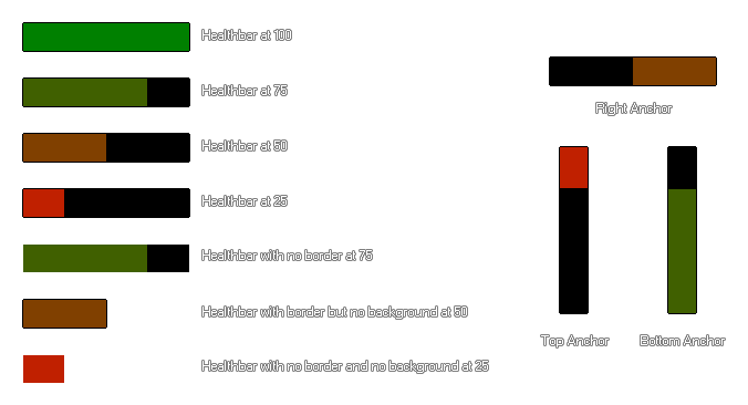 Vous pouvez définir différentes choses qui changent l'aspect visuel de la barre et ceux-ci sont illustrés dans l'image ci-dessous (notez que les couleurs utilisées ici sont c_green pour la valeur maximale et c_red pour la valeur minimale, mais vous pouvez utiliser les couleurs que vous souhaitez):