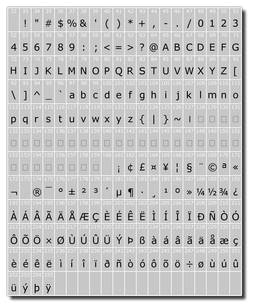 | U + 00FF | ÿ | c3 bf | LETTRE MINUSCULE LATINE Y DIAERÈSE |