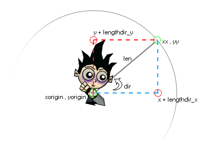 Cette fonction est utilisée pour obtenir la composante y d'une position "len" pixels à partir du point de départ et dans la direction "dir". Si vous imaginez un cercle autour de votre instance, puis imaginez un point n'importe où sur ce cercle, pour passer à ce point, nous devons déplacer l'objet de tant de pixels dans cette direction... donc cette fonction (utilisée avec lengthdir_x ) obtient la position de ce point sur le cercle à utiliser dans le code par l'instance. Voir l'image ci-dessous pour plus de détails: