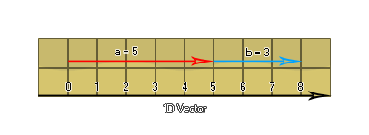 Au moment de créer un jeu de n'importe quelle complexité, vous devrez probablement faire face à des vecteurs. Ils sont utilisés en physique, en IA, en trigonométrie et bien d'autres situations, mais qu'est-ce qu'un vecteur? Eh bien, pour le dire simplement, un vecteur est une quantité dirigée. Commençons par regarder un vecteur 1 dimension, qui est juste le même qu'un seul nombre, en traçant une ligne numérotée avec une flèche commençant à zéro et se terminant à 5. C'est le vecteur a qui est égal à 5 et si nous dessinons une autre flèche partant du 5 et finissant au 8 nous avons le vecteur b qui est égal à 3.