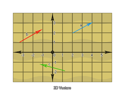 Vous devez vous rendre compte que peu importe où commence un vecteur, tout ce qui compte, c'est combien de temps et dans quelle direction il va. Donc le vecteur b commence à 5, est long de 3 unités et pointe vers le "droit", le rendant identique à un vecteur commençant par 0 et passant à 3. Maintenant, vous pouvez aussi ajouter ces vecteurs ensemble, en mettant bout à bout les deux vecteurs a et b pour obtenir le vecteur c qui est égal à 8. Qu'en est-il des nombres négatifs? Eh bien, si, dans l'image ci-dessus, un vecteur qui pointe vers le "droit" correspond à un nombre positif, vous pouvez voir qu'un vecteur pointant vers "gauche" correspondrait à un nombre négatif, ce qui rendrait un vecteur unidimensionnel plus qu'un nombre signé (+/-). Ceci explique le concept essentiel d'un vecteur: seule la longueur et la direction ("gauche" ou "droite" dans ce cas) comptent, pas la position.