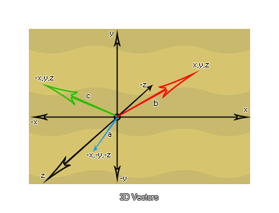 Cela signifie qu'un vecteur 2D est défini par deux valeurs, une position x et une position y par rapport à l'axe local [0,0]. Et qu'en est-il des vecteurs 3D? Eh bien, ils ont la dimension supplémentaire de «profondeur» à prendre en compte et seraient calculés comme des positions x, y et z autour d'un axe local quelque chose comme ceci: