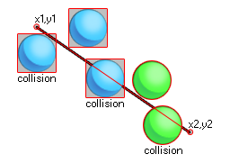 La ligne de collision vérifie le long d'une ligne du point x1, y1 au point x2, y2 pour une collision avec une instance de l'objet spécifié par l'argument "obj". Cette vérification peut être précise ou non, mais pour que les collisions précises puissent être activées, l'objet ou l'instance que vous recherchez doit également avoir des collisions précises activées pour leur sprite. Sinon, la vérification par défaut est basée sur les boîtes de délimitation. L'image suivante illustre comment cela fonctionne: