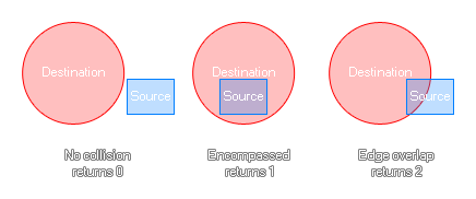 Cette fonction va vérifier une zone rectangulaire que vous définissez pour voir si elle n'est pas en collision, complètement dans les limites de destination, ou si elle est simplement en contact, une zone circulaire définie. Si elles ne touchent pas du tout, la fonction retournera 0, si la source est complètement dans la destination, elle retournera 1, et si elles se chevauchent simplement, elle retournera 2. L'image ci-dessous illustre ceci: