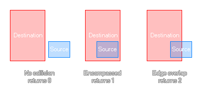 Cette fonction va vérifier deux zones rectangulaires que vous définissez pour voir si le rectangle source n'est pas en collision, complètement dans les limites des rectangles de destination, ou s'ils sont simplement en contact. Si elles ne touchent pas du tout, la fonction retournera 0, si la source est complètement dans la destination, elle retournera 1, et si elles se chevauchent simplement, elle retournera 2. L'image ci-dessous illustre ceci: