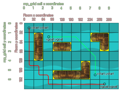 mp_grid_path(id, path, xstart, ystart, xgoal, ygoal, allowdiag);