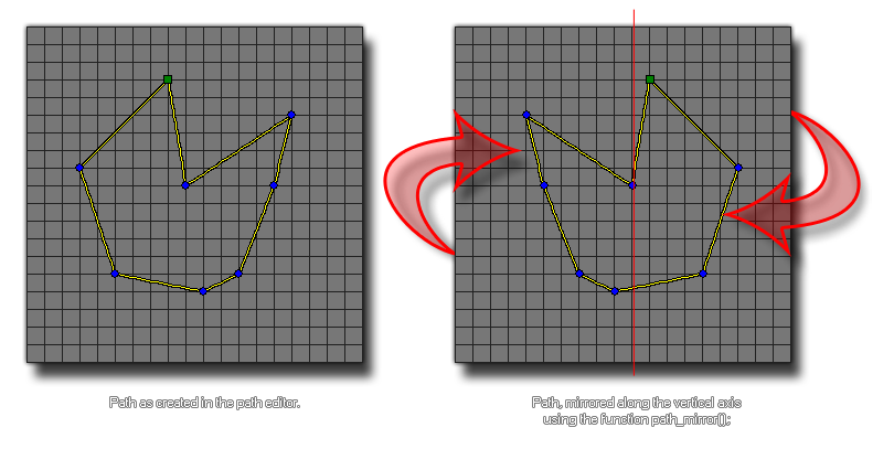 Cette fonction prend tous les points de chemin et les reflète le long de l'axe vertical. Cette fonction modifie la ressource de chemin réelle, et affectera donc de façon permanente la façon dont le chemin est utilisé par toutes les instances dans le jeu à partir du moment où la fonction est utilisée jusqu'à la fin de la partie.