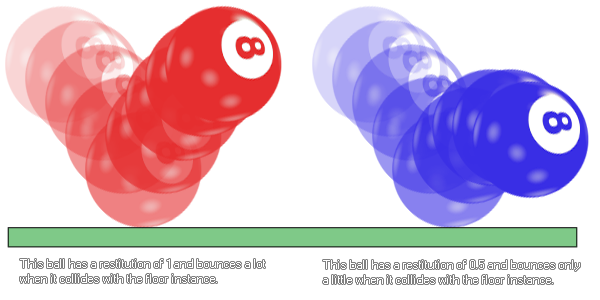 En physique, la restitution est définie comme «le retour d'un objet ou d'un système à son état initial après déformation élastique», mais comme les appareils de GameMaker Studio 2 sont des corps rigides et ne peuvent pas être déformés, la restitution est vraiment une façon de dire "Bouncy" l'appareil est. Ce paramètre affecte la valeur de rebondissement d'un objet lorsqu'il entre en collision avec d'autres objets et dépend d'autres forces agissant sur l'instance telles que la gravité et la friction. Il est généralement compris entre 0 et 1 (des valeurs supérieures peuvent être utilisées). mais peut donner des résultats imprévisibles). Voici une illustration de la façon dont cela fonctionne: