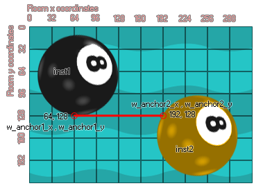 Comme vous pouvez le voir, les points d'ancrage sont spécifiés comme coordonnées de pièce. Il faut donc faire attention en les définissant, surtout si les instances sont créées en même temps que les articulations plutôt que d'être placées dans la pièce par l'éditeur de pièce. Vous devez également vous rendre compte que les articulations sont créées indépendamment de la taille de l'image-objet des instances ou des installations auxquelles elles sont rattachées. Ainsi, si vous créez une jointure de distance ailleurs que dans l'origine de l'instance, elle est toujours valide et contraindra les deux instances par rapport à la position à laquelle elle a été créée. Si vous définissez la valeur "col" sur true alors les deux instances peuvent interagir et entrer en collision les unes avec les autres, mais seulement si elles ont des événements de collision, mais si elle est définie sur false, ils ne vont pas entrer en collision, peu importe quoi.