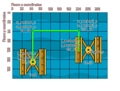 L'articulation de la poulie est utilisée pour relier deux instances dans le monde de la physique de telle sorte que le mouvement d'une influence directement le mouvement de l'autre. Ces articulations sont d'abord ancrées dans l'espace du monde en deux points, chacun relié à une instance en son centre de masse. Cela peut être modifié en définissant les coordonnées de l'ancre locale x / y par rapport à l'origine de l'instance, ce qui signifie que la connexion réelle de l'instance au point d'ancrage du monde physique peut être décalée ailleurs que son origine. L'image suivante illustre ceci: